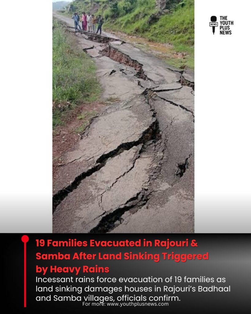 JAMMU/RAJOURI, Sept 1: At least 19 families were evacuated after land sinking incidents were reported in Rajouri and Samba districts of Jammu and Kashmir following heavy rains, officials said.According to authorities, 11 houses were vacated in Rajouri’s Badhaal village, which has been declared a “risk zone,” while eight houses were vacated in Samba district as a precautionary measure. The affected families have been shifted to safer locations, and relief measures are underway.Additional Deputy Commissioner (Kotranka), Dil Mir, confirmed that a vast portion of land in Badhaal village has developed cracks and is gradually sinking, posing a severe risk to life and property.The administration has urged residents to remain alert and assured that all necessary assistance, including temporary shelters and basic supplies, is being provided to the displaced families.