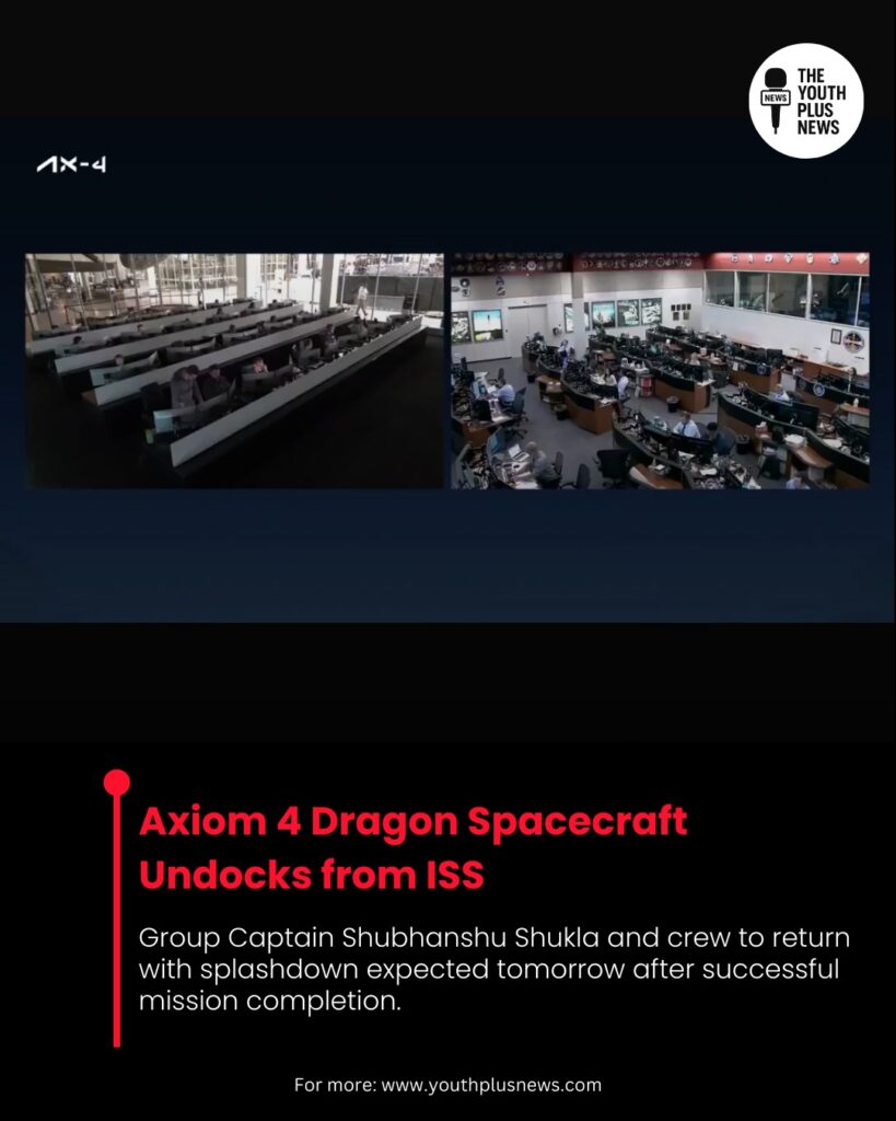 Axiom 4 Mission Update: The Dragon spacecraft has successfully undocked from the ISS. Group Captain Shubhanshu Shukla and the crew are expected to splash down tomorrow, marking the completion of their mission.
