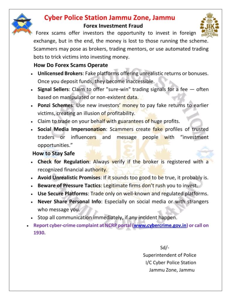 Forex investment/ trading signals lure for huge profit returns, but in reality loot the innocent investor. Be aware : Cyber Police Jammu