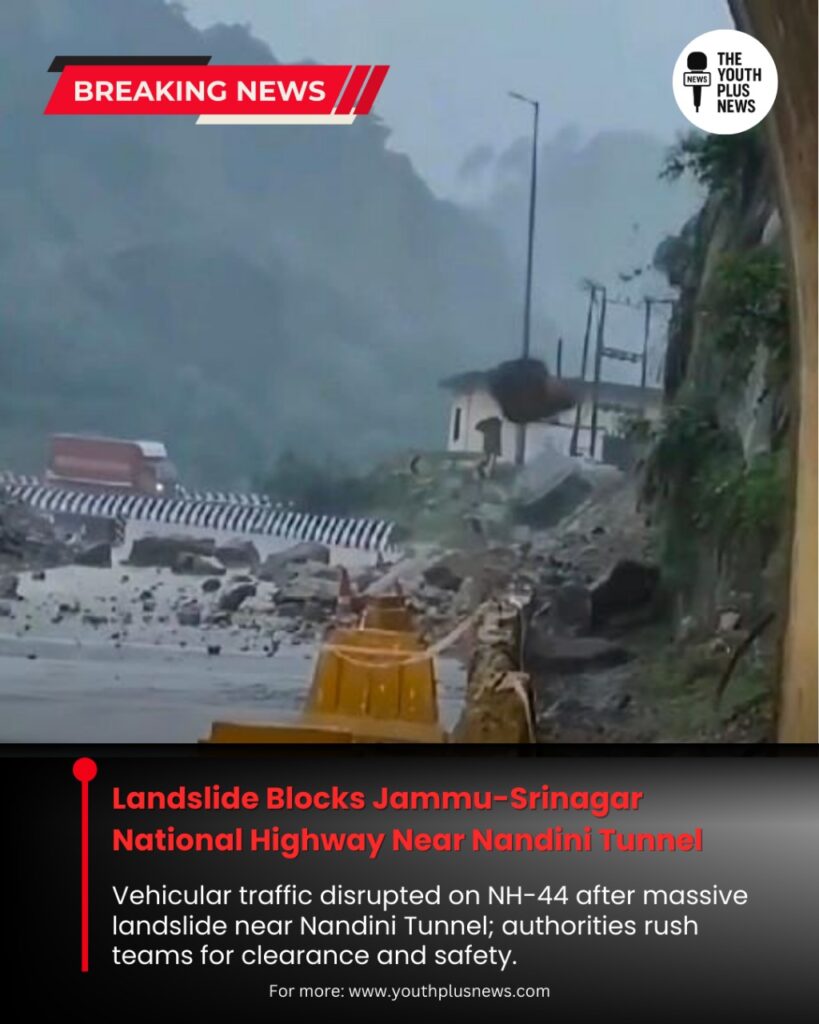 A landslide on Wednesday blocked the Jammu-Srinagar National Highway (NH-44) near the Nandini Tunnel, leading to a complete halt in traffic movement on the region’s most vital road link. The incident occurred amid heavy rains, which triggered sliding of debris and boulders onto the highway.