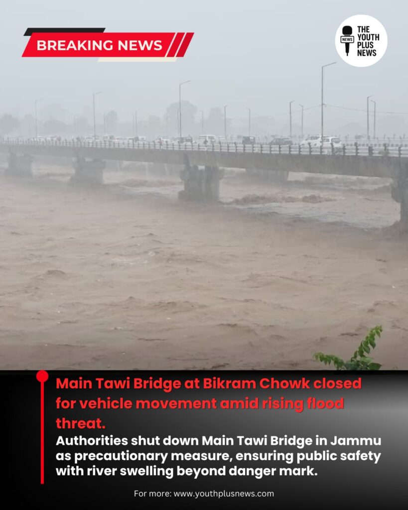 Authorities in Jammu have ordered the closure of the Main Tawi Bridge at Bikram Chowk for vehicular movement, citing rising water levels in the river and increasing flood risks. The step has been taken purely as a precautionary measure to safeguard lives and prevent accidents in case the situation worsens. The District Administration has advised citizens to strictly avoid the route and follow traffic advisories. Emergency services are on standby, and commuters are being diverted to alternate roads. Officials have urged people to remain calm, stay away from riverbanks, and cooperate with authorities as continuous rainfall adds to the challenges. Safety remains the administration’s top priority during this developing situation.
