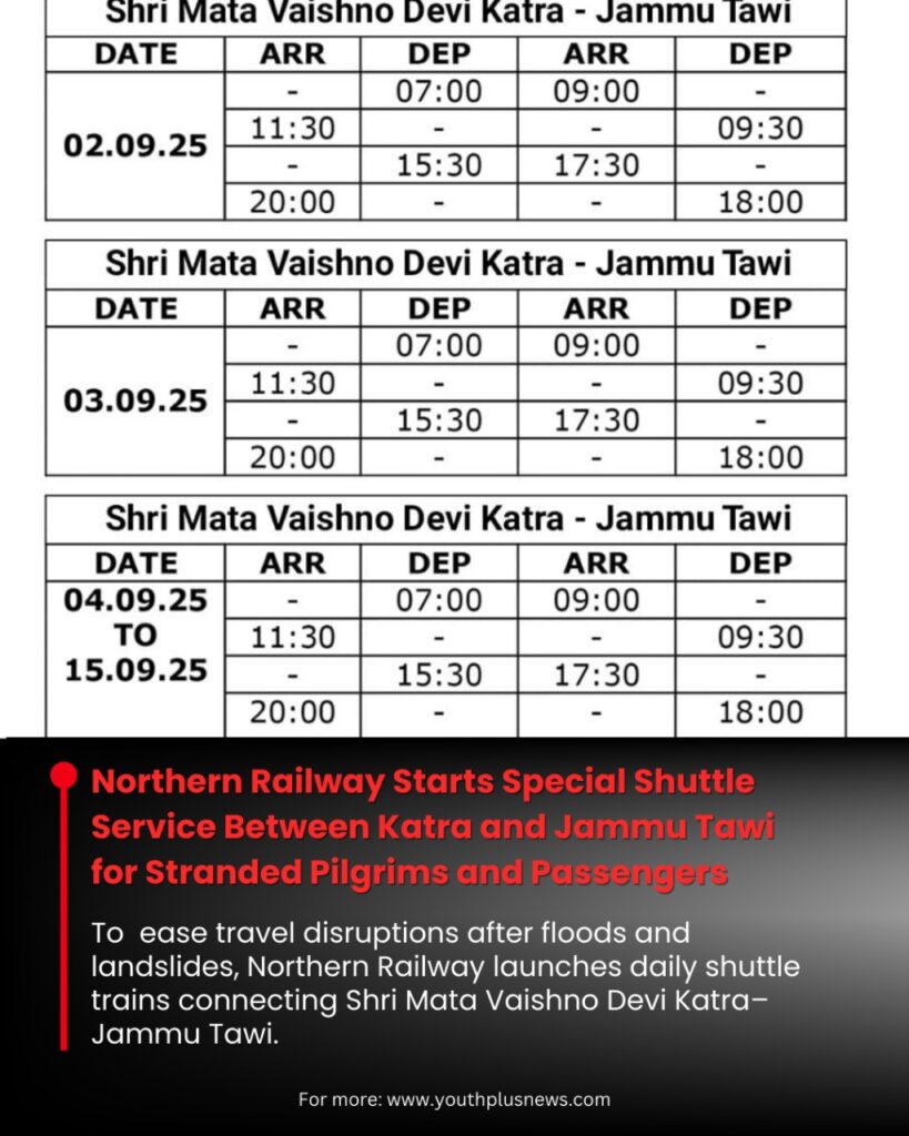 In view of travel disruptions caused by recent floods and landslides in Jammu and Kashmir, Northern Railway has introduced shuttle train services between Shri Mata Vaishno Devi Katra and Jammu Tawi. These services, operational from September 2 to September 15, 2025, aim to assist stranded pilgrims and passengers by providing reliable travel options. According to the official schedule, four daily shuttle services will run with departures at 07:00 AM, 09:30 AM, 03:30 PM, and 06:00 PM. This initiative ensures uninterrupted connectivity for devotees visiting the Vaishno Devi shrine and locals traveling to Jammu. The decision reflects Northern Railway’s proactive approach in prioritizing passenger welfare during natural calamities