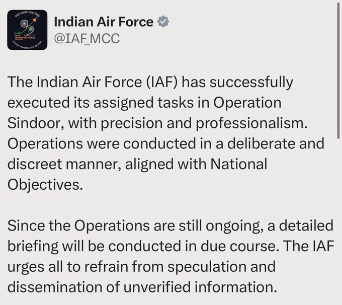 In a press briefing held earlier today, IAF spokesperson Wing Commander Vyomika Singh reaffirmed the operational status and clarified that further official details would be shared “in due course.” She emphasized the need for public restraint in sharing unverified claims, stating: