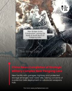 China is nearing completion of a military-linked complex on the eastern edge of Pangong Lake, featuring garages, a high-bay structure, and protected storage—a site located