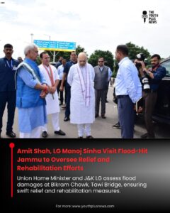 Union Home Minister Amit Shah, accompanied by Lieutenant Governor Manoj Sinha, visited flood-affected areas in Bikram Chowk and Tawi Bridge, Jammu, to assess the damage