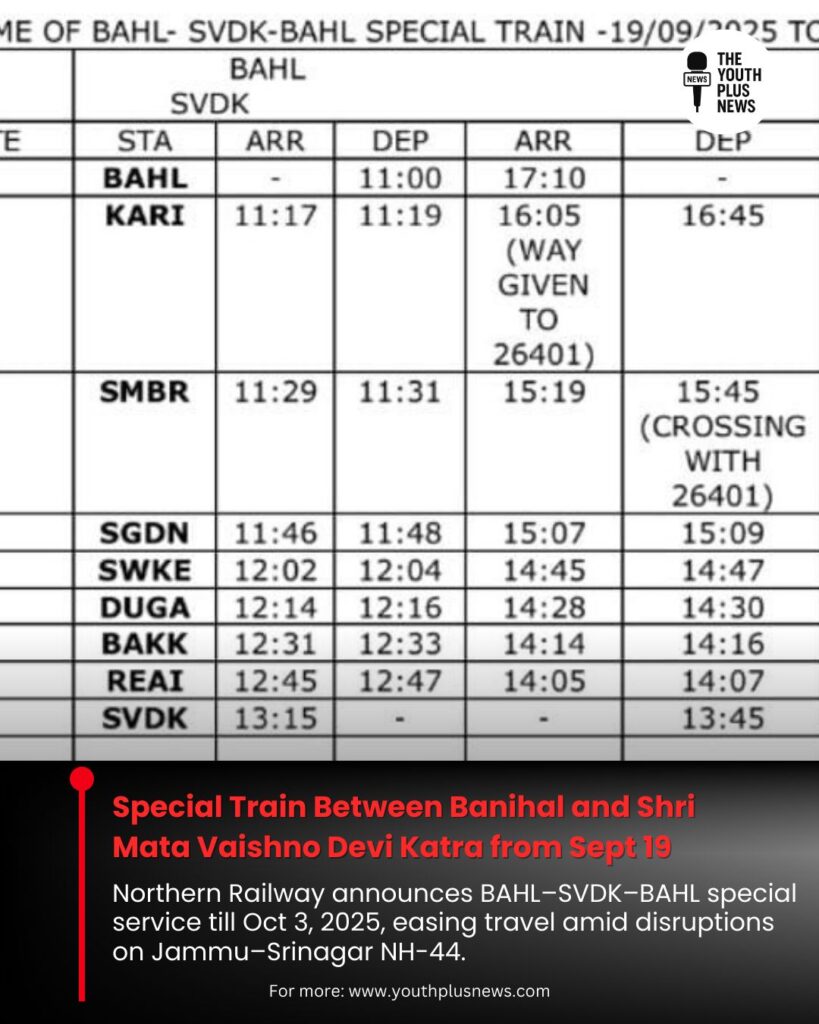 The special service will operate from September 19 to October 3, 2025, catering to both local commuters and pilgrims heading towards the holy shrine at Katra.